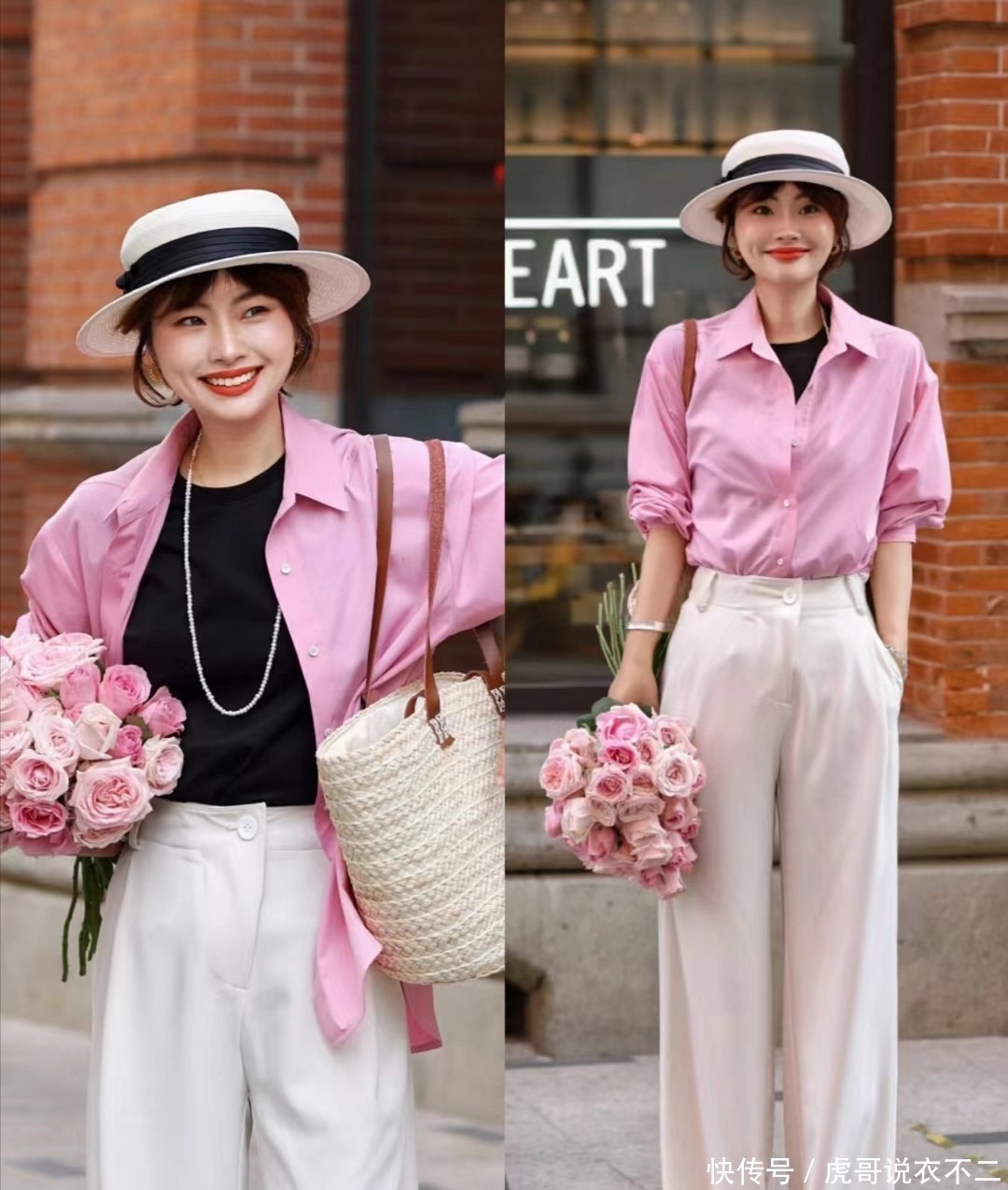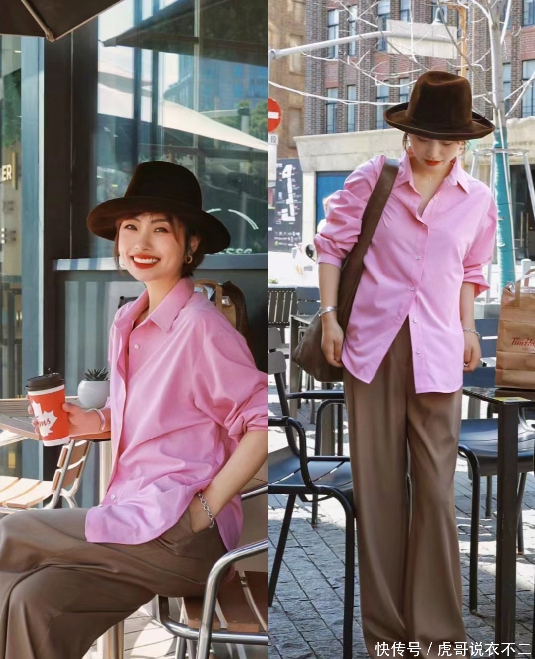 这件粉色的衬衫,不错组合宽大的阔腿裤,就能借助两件齐偏宽松的衣饰,加入倜傥的基调。