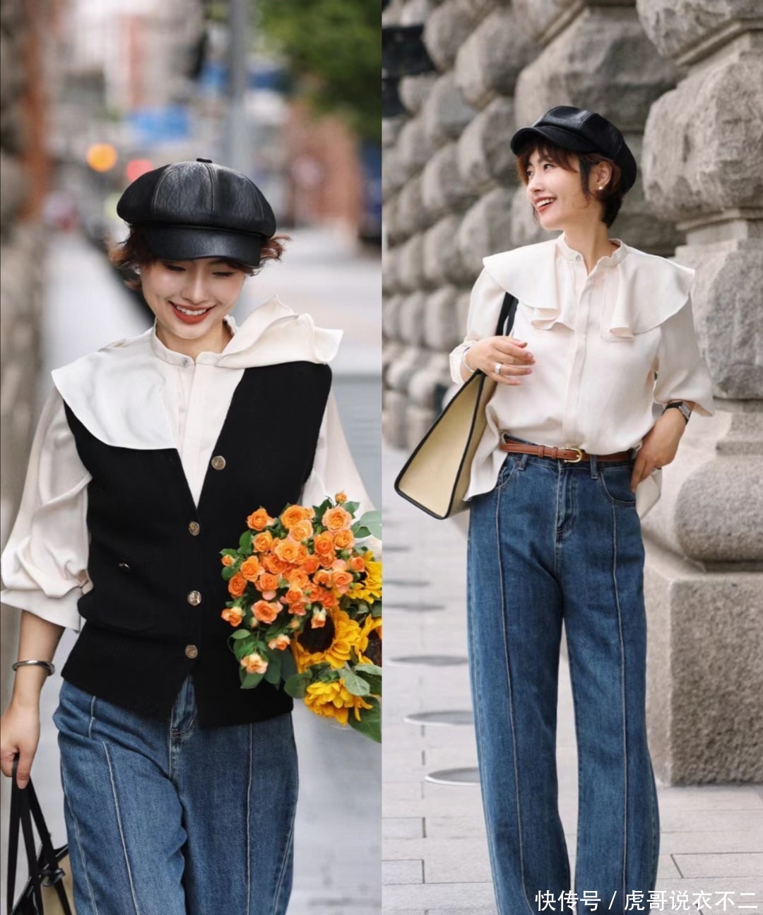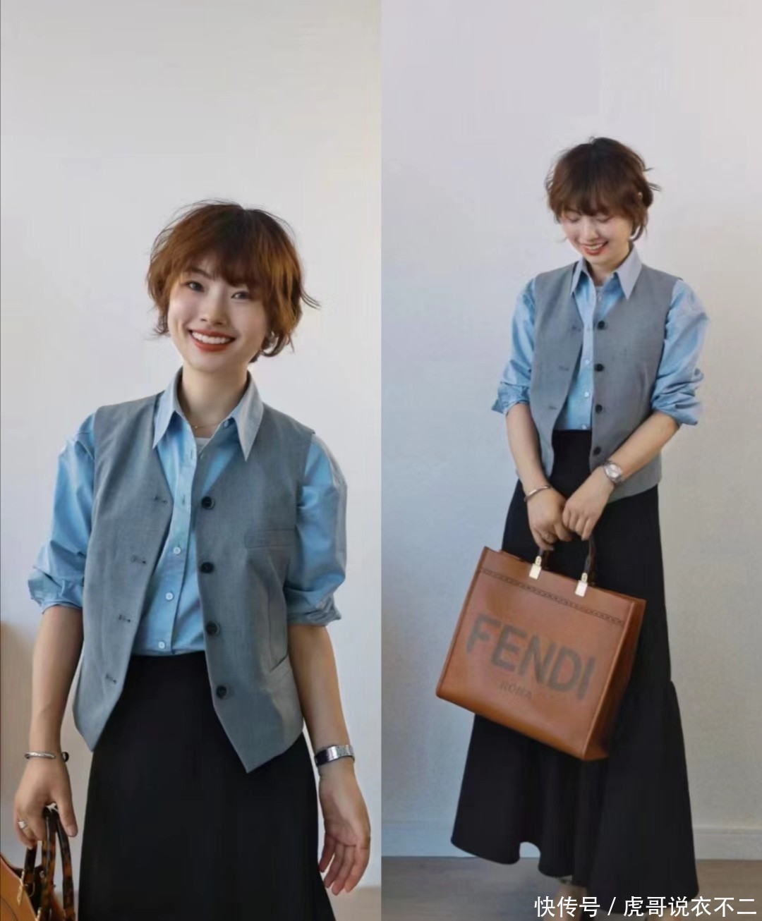 2、衬衫+西装马甲关于办事女性来说,她们念念要利用衬衫构造出不错上班的穿搭,提倡她们利用西装马甲进行叠穿。